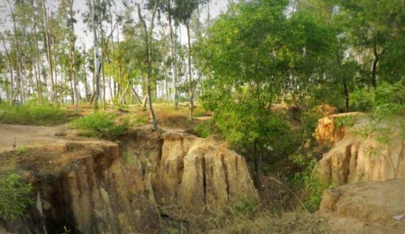 The Khoai can only support certain types of plants. It is a very poor soil for most types of agriculture practiced in the areas in which it is found. Yet often, a khoai maybe situated adjacent to a naturally forested area. Although a large area in Birbhum is covered by laterite, the areas where the laterite is exposed is termed as Khoai. In some areas the laterite is covered by a layer of ordinary soil and can support normal vegetation. In these areas, there are rice fields or mango groves or different varieties of plantations. These areas are not termed as khoai. In khoai areas there is no vegetation. Except for certain types of trees like Sonajhuri or Acacia, nothing grows on khoai. The beauty of khoai in and around Bolpur, Santiniketan enthralled Rabindranath Tagore and he immortalized khoai in his numerous writings. Famous painters like Nandalal Bose, Ramkinkar and Binodbehari Mukherjee painted khoai in many of their creations and khoai became a part of cultural heritage of Shantiniketan and Visva-Bharati.